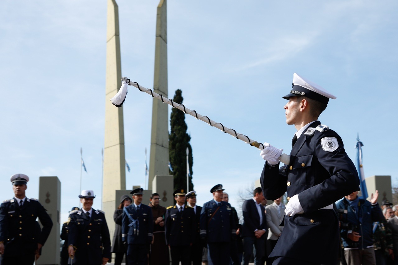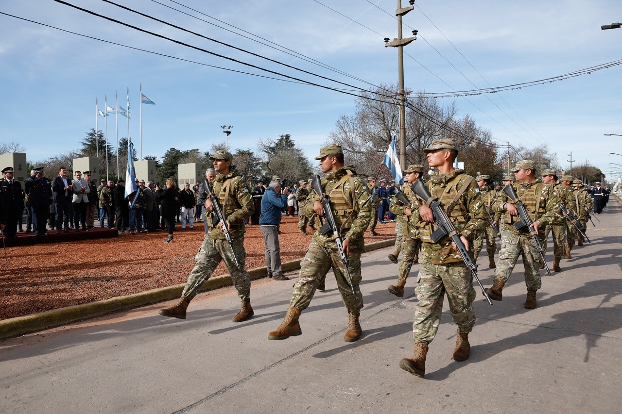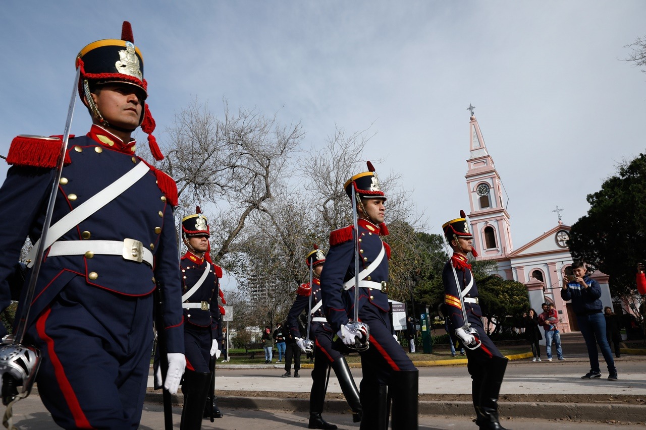 La jornada se inició con el izamiento de la bandera en el Pórtico de la Gloria, el escenario donde el general San Martín libró el único combate en suelo argentino hace más de 200 años. Luego, se abrió paso al desfile militar a lo largo del bulevar Sargento Cabral con la participación de soldados y cadetes de 6º año del Liceo Aeronáutico Militar de Funes, soldados voluntarios, efectivos del Batallón de Apoyo Logístico San Lorenzo del Ejército Argentino y cadetes del Instituto de Seguridad Pública de Santa Fe y de la Policía Comunitaria de Rosario.