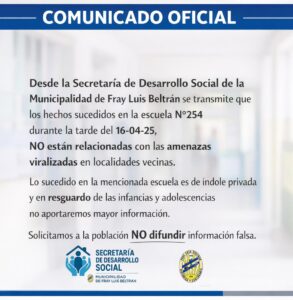 “Lo sucedido en la mencionada escuela es de índole privada y, en resguardo de las infancias y adolescencias, no aportaremos mayor información”, señala el comunicado oficial. Y agrega: “Solicitamos a la población NO difundir información falsa”.