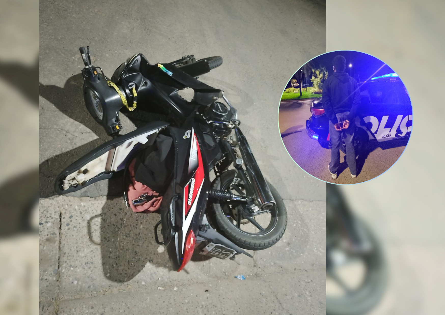 Según informaron fuentes oficiales, al intentar identificar a dos masculinos que circulaban en motocicleta, estos detuvieron su marcha y emprendieron la fuga en dirección norte. En su huida, arrojaron el rodado sobre la vereda en la zona de la rotonda y continuaron a pie.