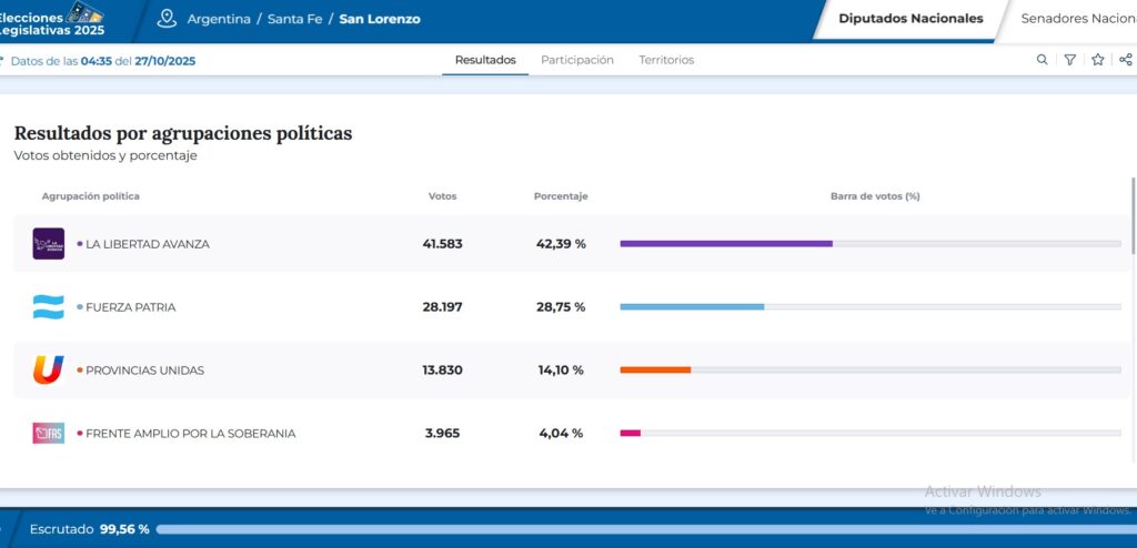 La ola violeta también se hizo sentir con fuerza en el departamento San Lorenzo, donde La Libertad Avanza (LLA) obtuvo una victoria arrasadora, extendiendo su dominio en el interior santafesino. Los resultados ratifican el batacazo libertario en la provincia de Santa Fe, donde el oficialismo nacional se impuso en 16 de los 19 departamentos.
