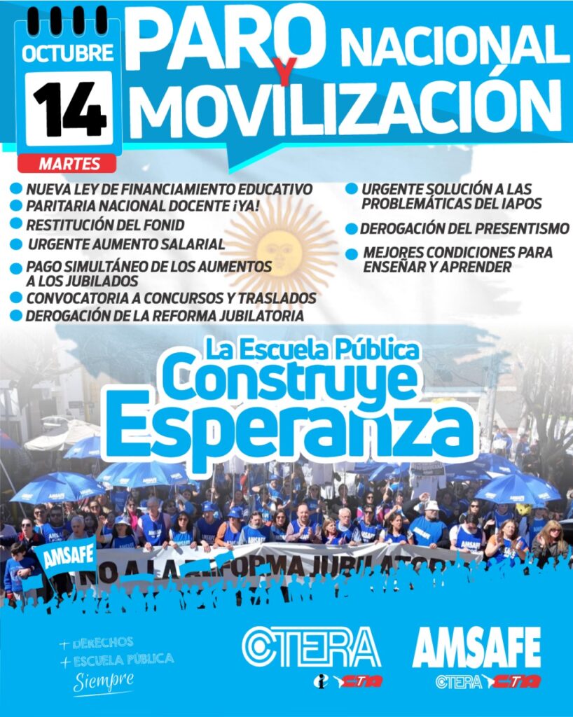 La Confederación de Trabajadores de la Educación de la República Argentina (CTERA) anunció un plan de lucha que incluye una Jornada Nacional con actividades en la vía pública y un Paro Nacional con movilización. Como consecuencia, el pasado miércoles 8 de octubre no hubo clases en las escuelas públicas de todo el país, medida a la que se adhiere la Asociación del Magisterio de Santa Fe (AMSAFE).