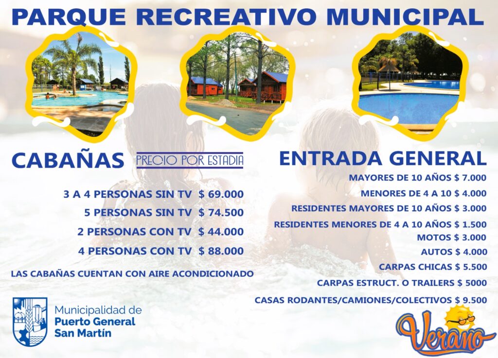 El municipio difundió los valores vigentes para el acceso al Parque Recreativo Municipal, el uso de cabañas y el ingreso de vehículos y carpas. Los precios rigen para vecinos y visitantes y contemplan beneficios para residentes.