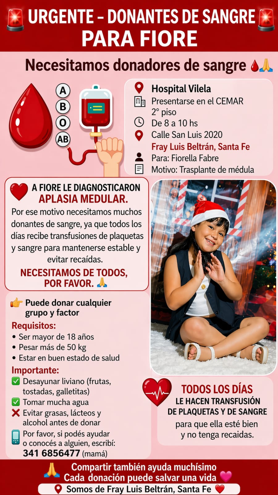 Una campaña solidaria se activó en las últimas horas para conseguir donantes de sangre para Fiorella Fabre, una niña de 7 años oriunda de Fray Luis Beltrán que se encuentra internada en terapia intensiva a la espera de un trasplante de médula ósea.