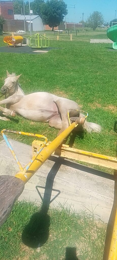 Cerca de las 13:30, personal de la agrupación se constituyó en el lugar y constató que el equino yacía recostado sobre su costado derecho, con una de sus patas traseras atrapada en el interior de la manija de agarre de un subibaja. La extraña posición le impedía ponerse en pie y mantenía al animal en situación de sufrimiento.