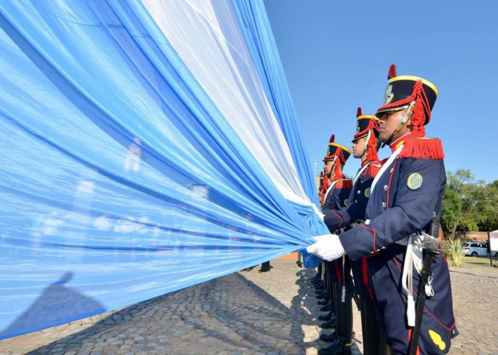 Tras la realización del Solemne Tedeum en la Parroquia San Lorenzo Mártir y del izamiento de la enseña patria en el Pórtico de la Gloria, una caravana de agrupaciones tradicionalistas unió el Campo de la Gloria con la institución educativa local. A su arribo, comenzó la ceremonia, con el ingreso de las banderas y la entonación del Himno Nacional, ejecutado por la Banda Municipal de Música.