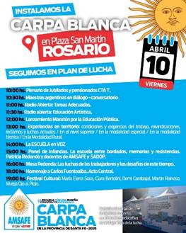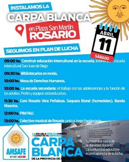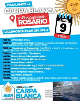La Carpa Blanca de la dignidad docente, símbolo histórico de la lucha docente en defensa de la escuela pública, continúa su recorrido por la provincia y llegará a la ciudad de Rosario los días 9, 10 y 11 de abril, instalándose en Plaza San Martín. Bajo la consigna “Seguimos en plan de lucha”, este espacio itinerante busca visibilizar las demandas del sector y fortalecer el compromiso colectivo por una educación pública con dignidad y derechos.