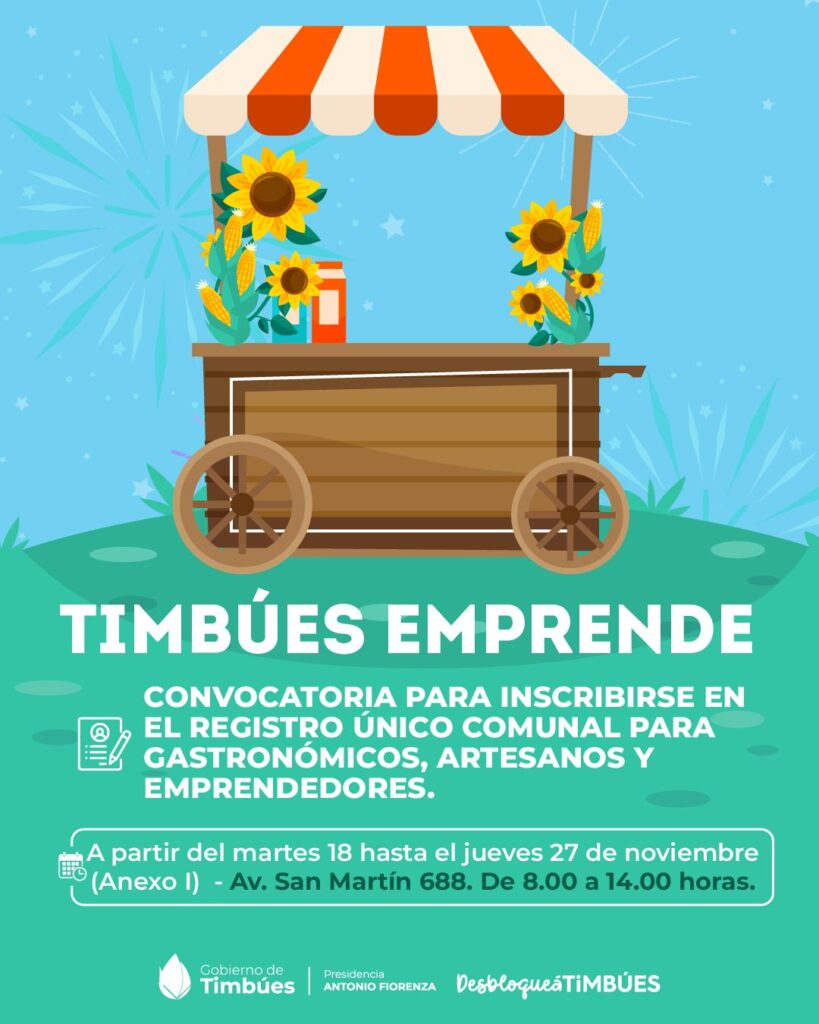 El Gobierno Comunal de Timbúes anunció la apertura del Registro Único de Emprendedores Gastronómicos y Artesanos “Timbúes Emprende”, un requisito indispensable para quienes quieran participar de los eventos organizados por la comuna.