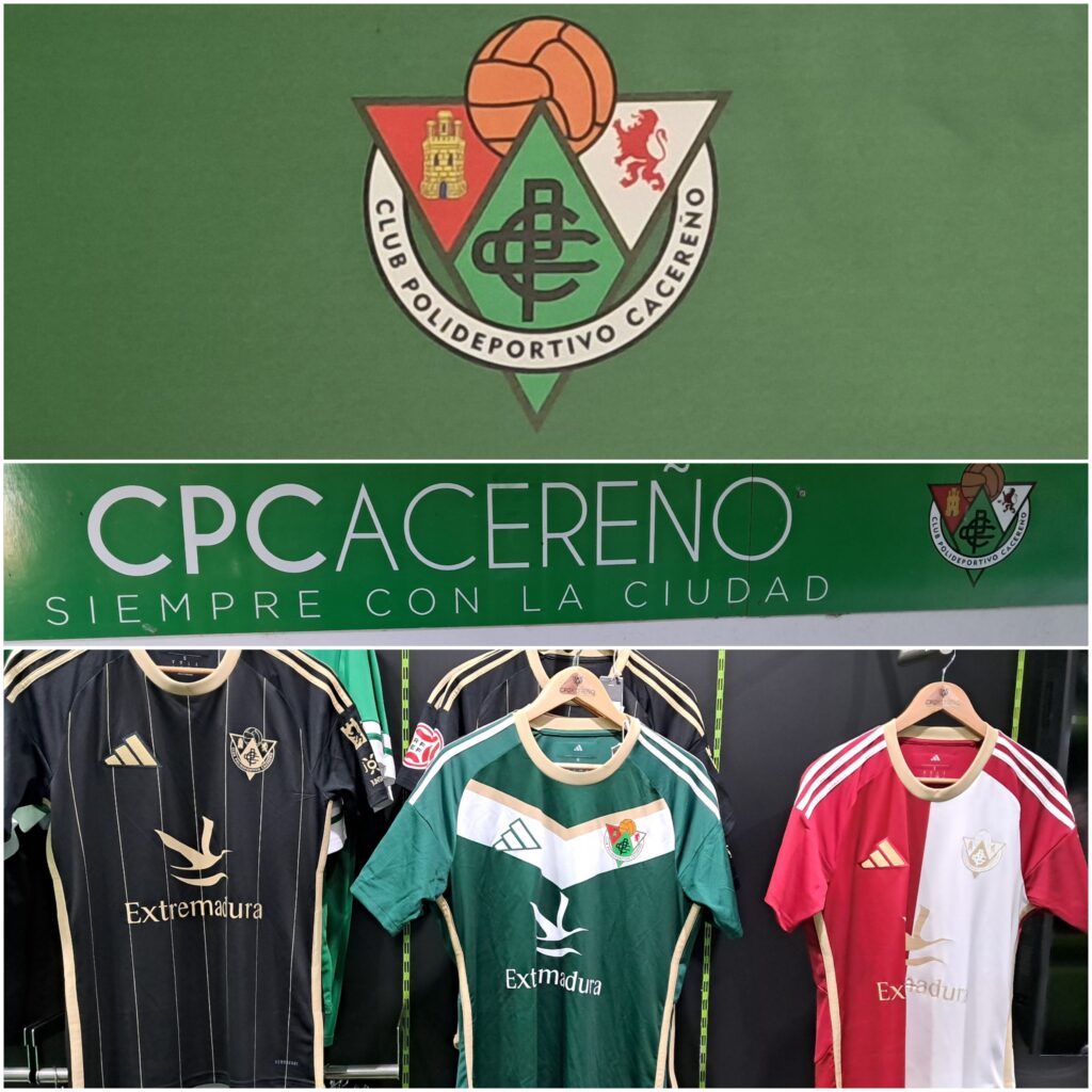 Escudo del CP Cacereño (Superior), cartel de identidad (Centro)  y Camisetas Oficiales del Decano para la temp. 25/26 de Primera Federación (Inferior)