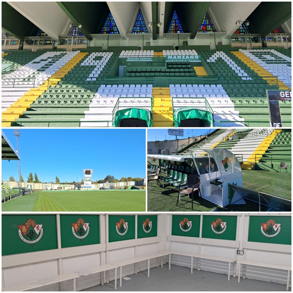 Tribuna Oficial (Superior), campo y juego y sector detrás del arco donde se está construyendo la nueva grada (Centro Izq), banco de suplentes (Centro Der) y vestuario visitante (Inferior)