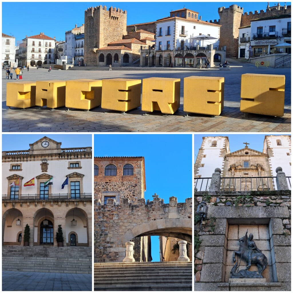 Plaza Mayor y letronas de la ciudad (Superior), edificio del Ayuntamiento-Municipalidad (Inferior Izq), Torre de Bujaco y Arco de la Estrella (Inferior Cen.) e Iglesia de San Francisco Javier y estatua del patrono San Jorge (Inferior Der), sitios distintivos de la ciudad de Cáceres