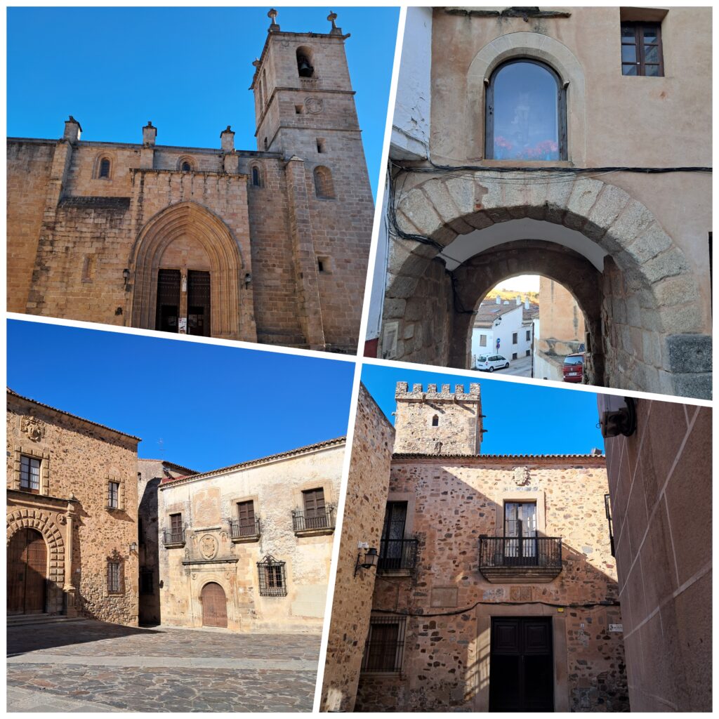 Concatedral de Santa María (Superior Izq), Arco de Cristo (Superior Der), Torre de Bujaco y Arco de la Estrella (Inferior Cen.) Palacio Episcopal y Casa de los Ovando (Inferior Izq ) y Palacio de los Golfines de Abajo (Inferior Der ), construcciones emblemáticas de la ciudad Monumental – barrio de intramuros- de Cáceres